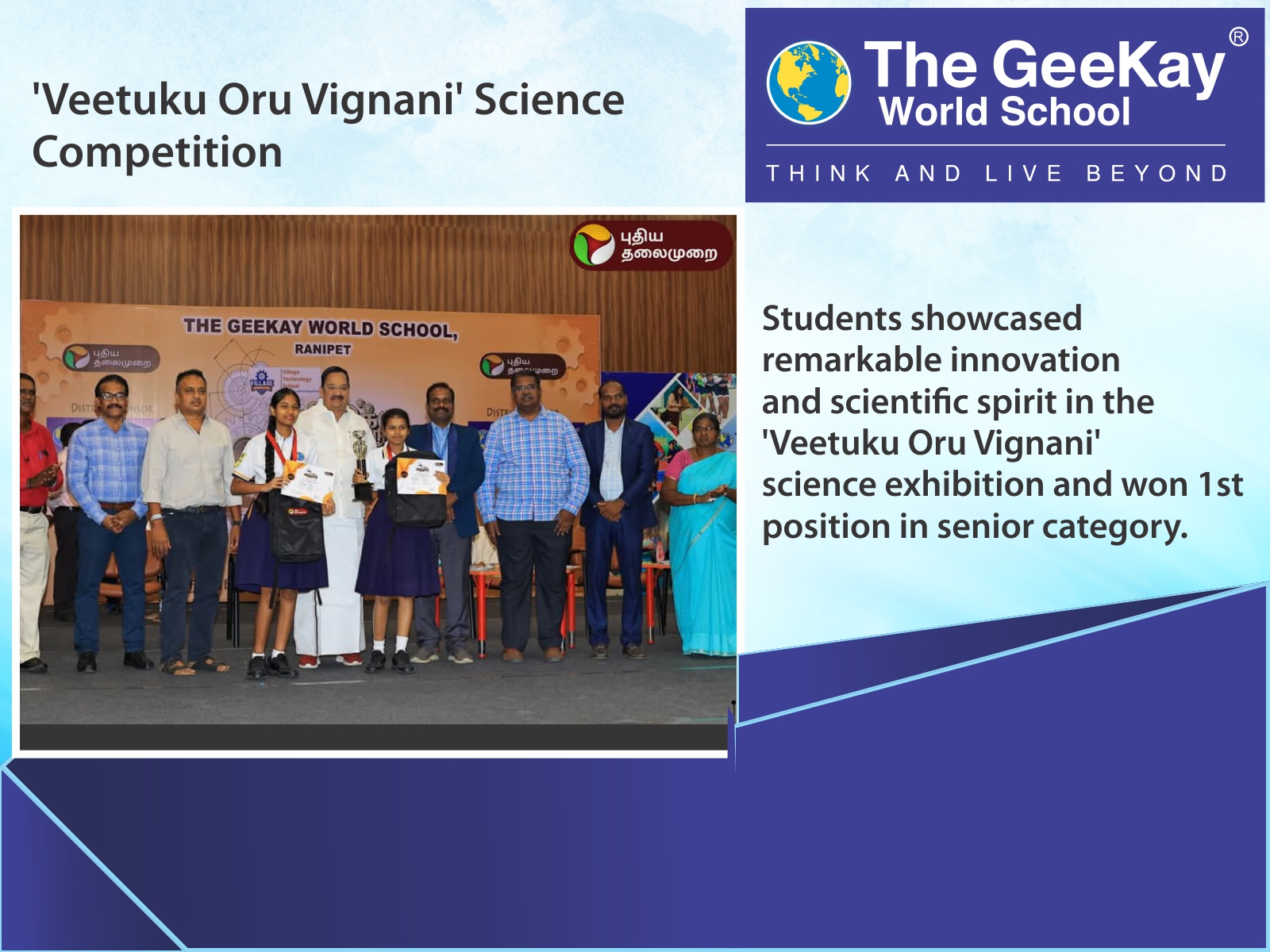 What can I say? The Geekay World School is without doubt the best school I have ever studied in. All the classes taken here are really interactive. The teachers help us understand any hard concept easily. Coming to sports, the school has a well-maintained football pitch, a basketball court, a tennis court and all the equipments needed to play. And the GC3 which is our Annual day celebration, is the grandest in town, with a big stage, a lot of bright lights, stalls among other things that brighten the event and of course we the students who give the event life. How can I not talk about the infrastructure when speaking about TGWS? The school has top class amenities with everything that a Number 1 day-cum boarding school in the whole state of Tamil Nadu needs.